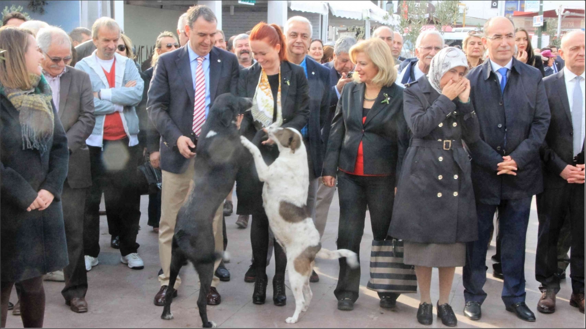 Ayvalık’ta düzenlenen 12. Uluslararası Ayvalık Zeytin Hasat Günleri kapsamında tören alanına gelen iki sokak köpeğine tören boyunca müdahale edilmemesi ve gönüllerince tören alanında gezinmeleri tebessümlerle karşılandı. Zaman zaman Belediye Başkanı Rahmi Gençer ve eşine kendilerini sevdiren iki sokak köpeği, zaman zaman da gösteri yapan efelerin arasına katıldı.