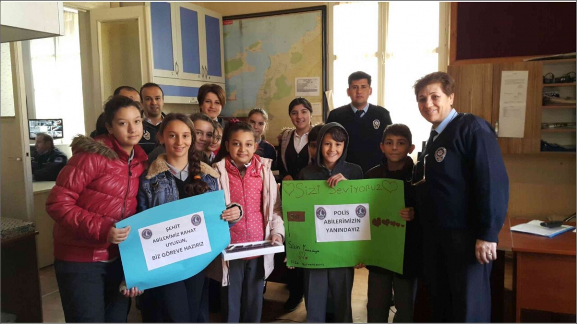 Öğrencilerin hazırladıkları birlik ve beraberlik mesajı veren pankartlarla ‘Polisimizin Yanındayız’ mesajları vererek gerçekleştirdikleri ziyarette; karakol personeli polis memurları da öğrencilere tatlı ikramında bulundu.